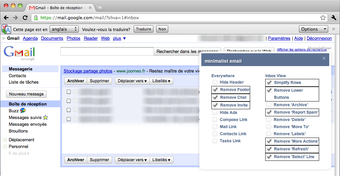 Une fois installée, Minimalist Email for Gmail loge automatiquement en haut à droite de l'interface Gmail le menu Minimalist Email - qui mériterait lui aussi un petit relooking. L'utilisateur peut alors faire disparaître temporairement chat, invitations, publicités, en-tête, note de bas de page, etc directement depuis le navigateur. Pratique, les modifications prennent effet instantanément pour vous donner un avant-goût du résultat.